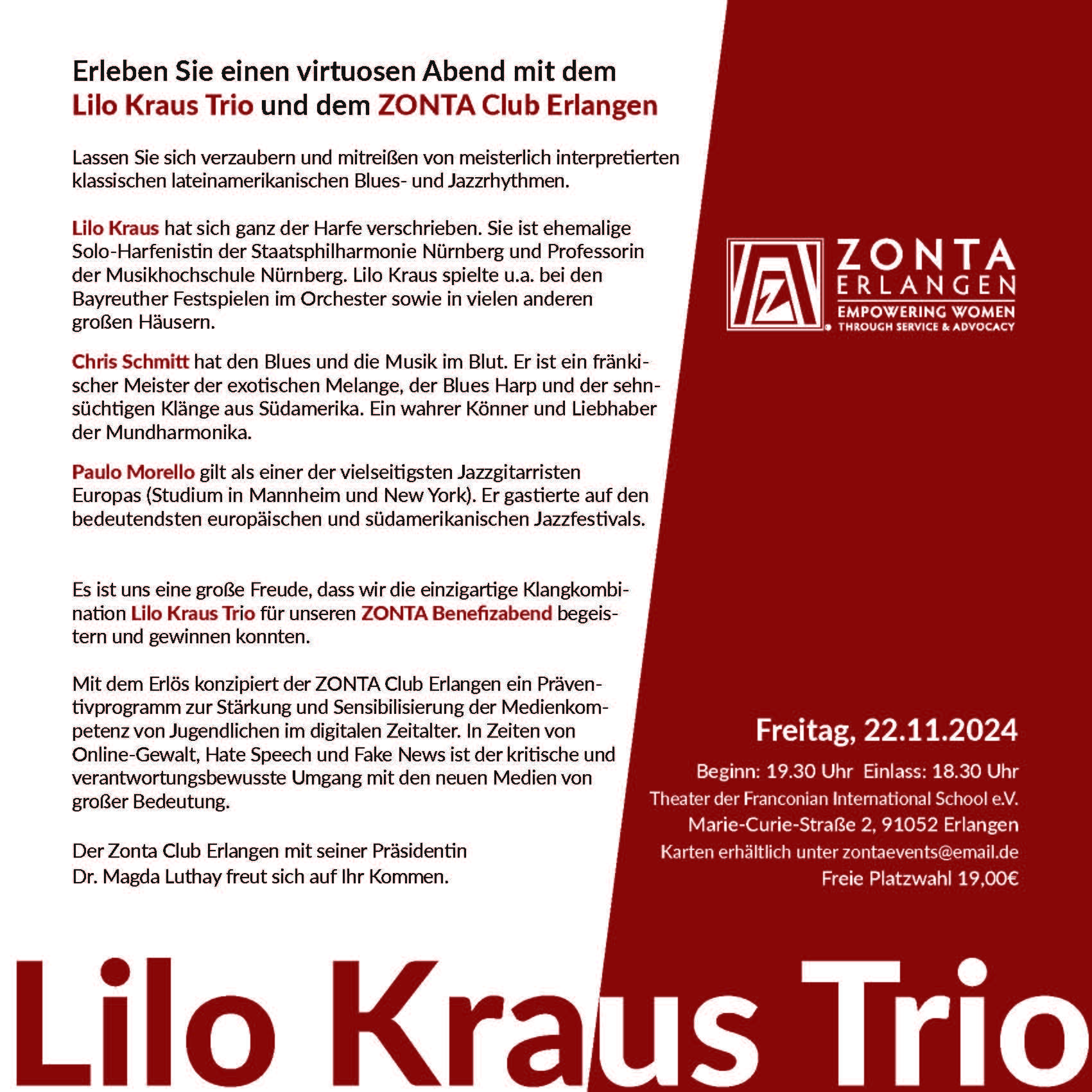 Das Lilo Kraus Trio hat an diesem wunderbaren Novemberabend seine Zuschauer mit meisterlich interpretierten klassischen lateinamerikanischen Blues- und Jazzrhythmen verzaubert. Lilo Kraus ist ehemalige Solo-Harfenistin der Staatsphilharmonie Nürnberg und Professorin der Musikhochschule Nürnberg. Chris Schmitt ist ein fränkischer Meister der exotischen Melange, der Blues Harp und der sehnsüchtigen Klänge aus Südamerika. Ein wahrer Könner der Mundharmonika. Paulo Morello gilt als einer der vielseitigsten Jazzgitarristen Europas. Das Benefizkonzert fand im Theaterder Franconian International School e.V. statt. Mit dem Erlös in Höhe von 5.600 EUR konzipiert der ZONTA Club Erlangen ein Präventivprogramm zur Stärkung und Sensibilisierung der Medienkompetenz von Jugendlichen im digitalen Zeitalter. In Zeiten von Online-Gewalt, Hate Speech und Fake News ist der kritische und verantwortungsbewusste Umgang mit den neuen Medien von großer Bedeutung.